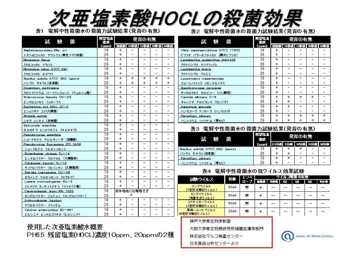 次亜塩素酸水は高い除菌力がありほぼ全ての細菌、ウィルスを除菌します。 - ※次亜塩素酸水は塩と水だけを電気分解して生成された弱酸性の水溶液です。